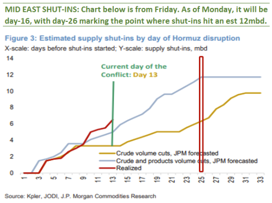 By this Friday, assuming no change to the current state of the strait, we estimate the supply cuts will approach 12mbpd. Just how impactful will that be for prices? Estimates vary but many see a $3-$4 impact per every 1mm worth of production cuts. Said differently, even assuming no further escalations or attacks on gulf infrastructure, this back of the envelope math and the dynamics in the strait alone give line of sight to $120/bbl by Friday ($3.5/bbl * ~5.5mm incremental production cuts).