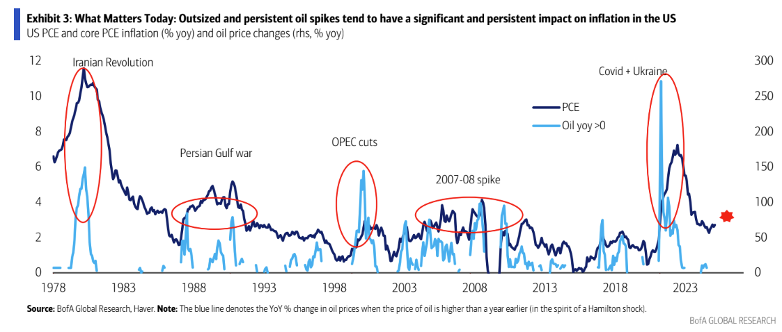 BofA Chief Economist Claudio Irigoyen writes that “only marked and persistent spikes in the price of crude trigger persistent inflationary cycles.” The economics team sees risks to the US economy with a persistent spike in crude prices from tightening financial conditions, spending power erosion, and capex delays.