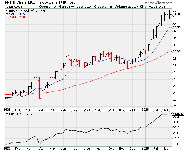 Tough to find many geographies green this month, but the Norway Index ETF is now up nine weeks in a row thanks to their energy company overweighting…
