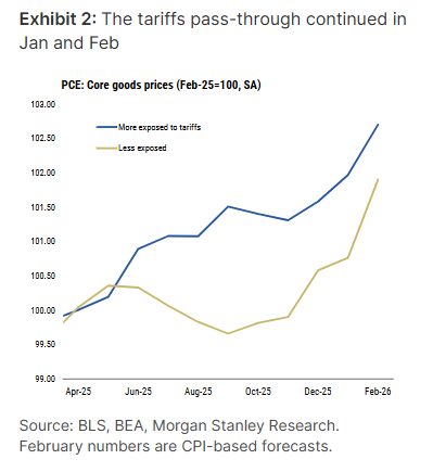 Tariff pass-through has been uneven, but it appears firms used the typical annual price reset at the beginning of the year to pass through cost pressures stemming from trade policy. Goods more exposed to tariffs continued to increase in January and are expected to continue that trend in February (see chart below). Goods less exposed to tariffs also increased recently, but we think that the strength in that group was mostly driven by noise in software and jewelry.