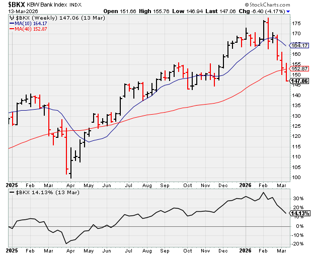 Sure the index is concerned about higher interest rates and a flatter yield curve. And also a slowdown in capital markets activities. But the high-teens percentage pullback is such a short time also suggests that an increasing number of investors are beginning to worry about bank loan books. While our nation's banks can handle a few cockroaches, it will have a more difficult time if their customers are wrestling with $120 crude oil. Keep a close eye on the bank stocks.