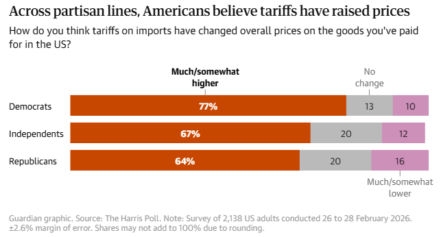 Seven in 10 Americans say Donald Trump’s tariffs have led to them paying higher prices, according to an exclusive new poll for the Guardian.