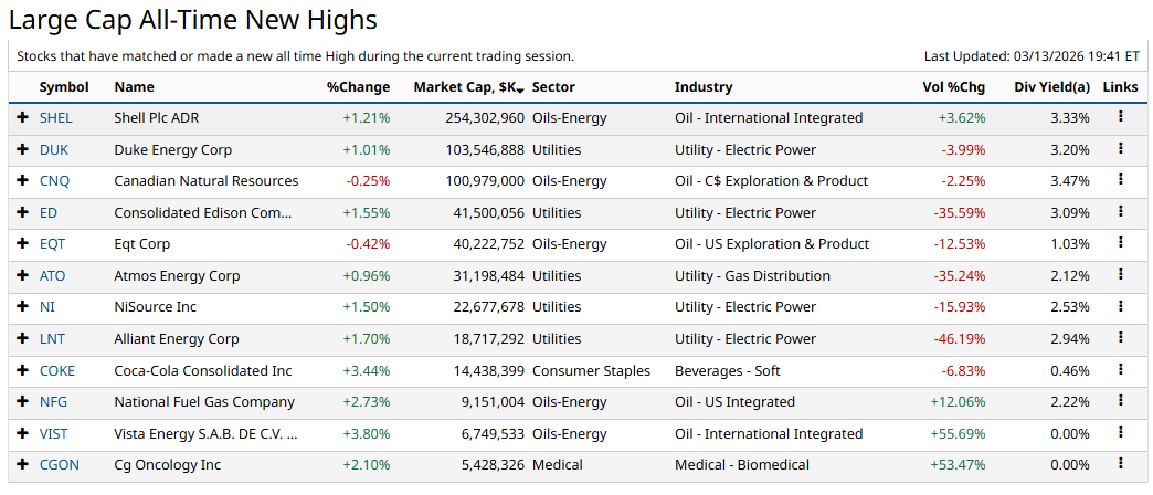 A glance at Friday's new all-time highs shows a list dominated by Energy and Power companies…