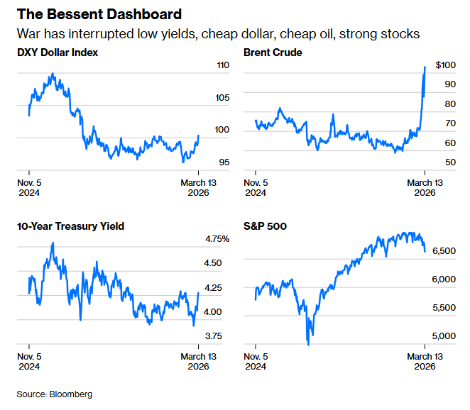Even if the blow is less than catastrophic, it is startling how few benefit. The direction of travel is inimical for the Trump administration. Treasury Secretary Scott Bessent’s strategy has involved a weak dollar, lower yields and cheaper oil, combined with a strong stock market, and it was going very well until the last few weeks. The war has thrown that into reverse: