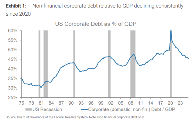The first question in assessing systemic risk is straightforward: has leverage in the system increased? The short answer is no. Historically, a sustained rise in aggregate corporate debt relative to GDP has been a reliable signal of mounting systemic stress. By that metric, the evidence is not compelling. The overall scale of sub investment grade lending relative to the economy remains contained. Even after accounting for the growth of private credit, total non-investment grade corporate lending as a share of GDP is broadly unchanged from a decade ago. In fact, aggregate corporate debt to GDP ratios have declined in recent years. (Exhibit 1). These trends suggest that the stock of riskier corporate borrowing has not expanded to levels consistent with broad based systemic vulnerability.