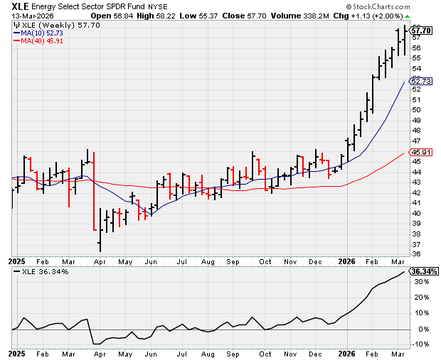 Back to stocks, the Energy Sector ETF is now up twelve weeks in a row…