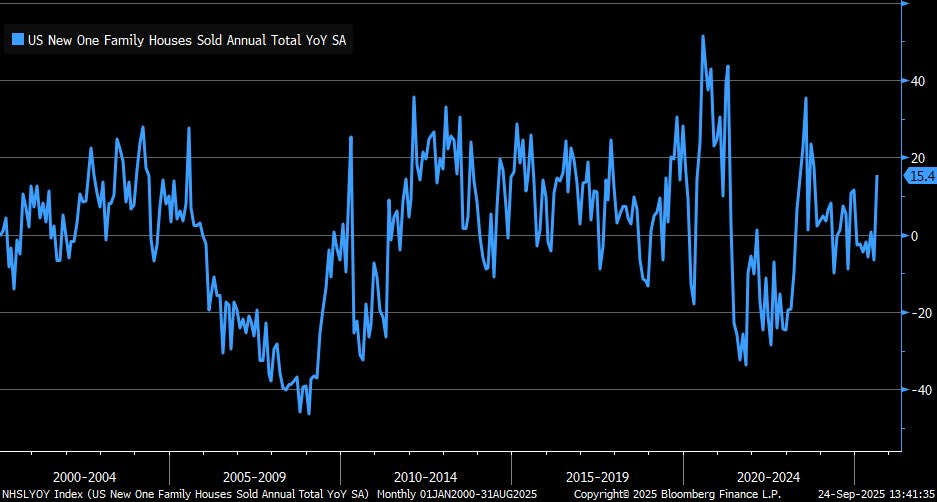 @LizAnnSonders: New single-family home sales spiked in August … year/year pace moved up to +15.4%