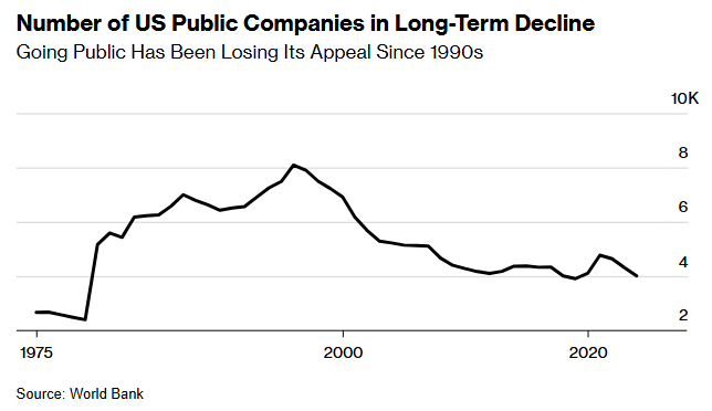 The number of American public companies stood at around 4,000 last year, around half the number there were in 1996, according to a Bloomberg Intelligence report. On the sidelines are nearly 800 closely held US companies valued at more than $1 billion apiece, including three mega-unicorns — SpaceX, Anthropic and OpenAI — each valued at over $100 billion, BI’s report showed.