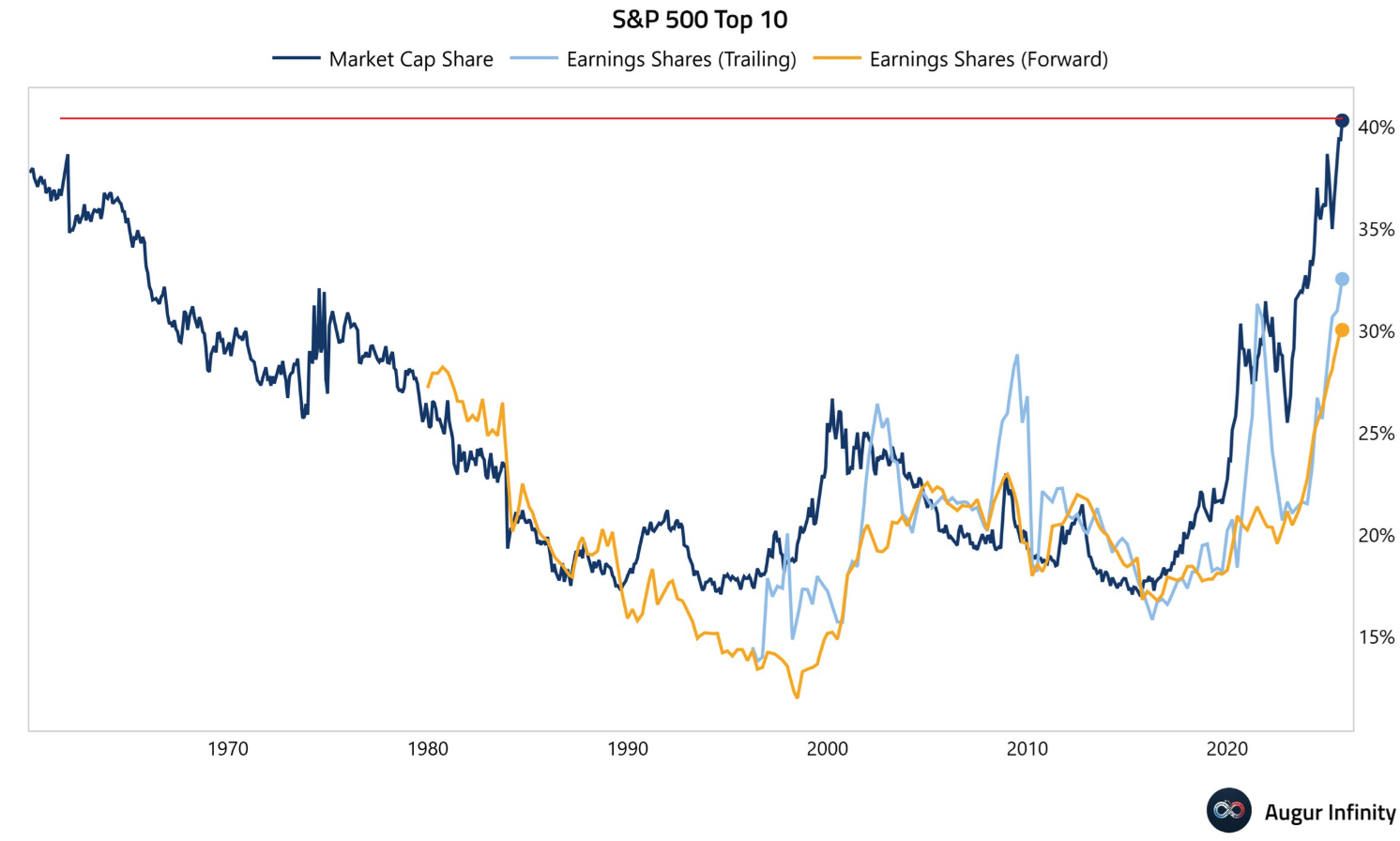 The top 10 S&P 500 stocks now account for a record 40%+ of the S&P 500's market capitalization…