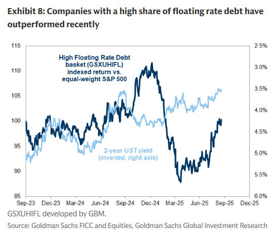 Since the start of August, a basket of stocks with high shares of floating rate debt (GSXUHIFL) has rallied by +12% vs. +3% for the equal-weight S&P 500. In general, rate-sensitive equity trades are less compelling now that market expectations for the Fed are in line with our economists' forecasts. However, the pair trades 4% below its level from late 2024 when the 2-year UST yield was at a similar level to today. Furthermore, in addition to the valuation boost most stocks receive from falling long-term interest rates, these companies receive a tangible earnings benefit from lower near-term interest rates. We estimate that every 100 bp decline in the cost of debt would boost the earnings of these companies by slightly more than 5%. These stocks should also benefit from the increase in interest deductibility legislated in the "One Big Beautiful Bill" fiscal package.