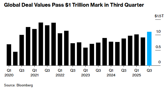 Global deal values have topped $1 trillion in a third quarter for only the second time on record, according to data compiled by Bloomberg, thanks to transactions like Monday’s roughly $55 billion take-private of video game maker Electronic Arts Inc. by a consortium including Silver Lake Management. It means values are now up 27% at around $3 trillion for the year-to-date and on course for their best finish since 2021…