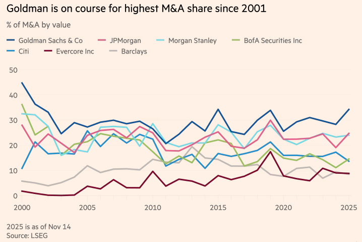 The bank has advised on 34 per cent by value of the $3.8tn of global mergers announced this year, according to data from LSEG, up from 28 per cent in 2024.