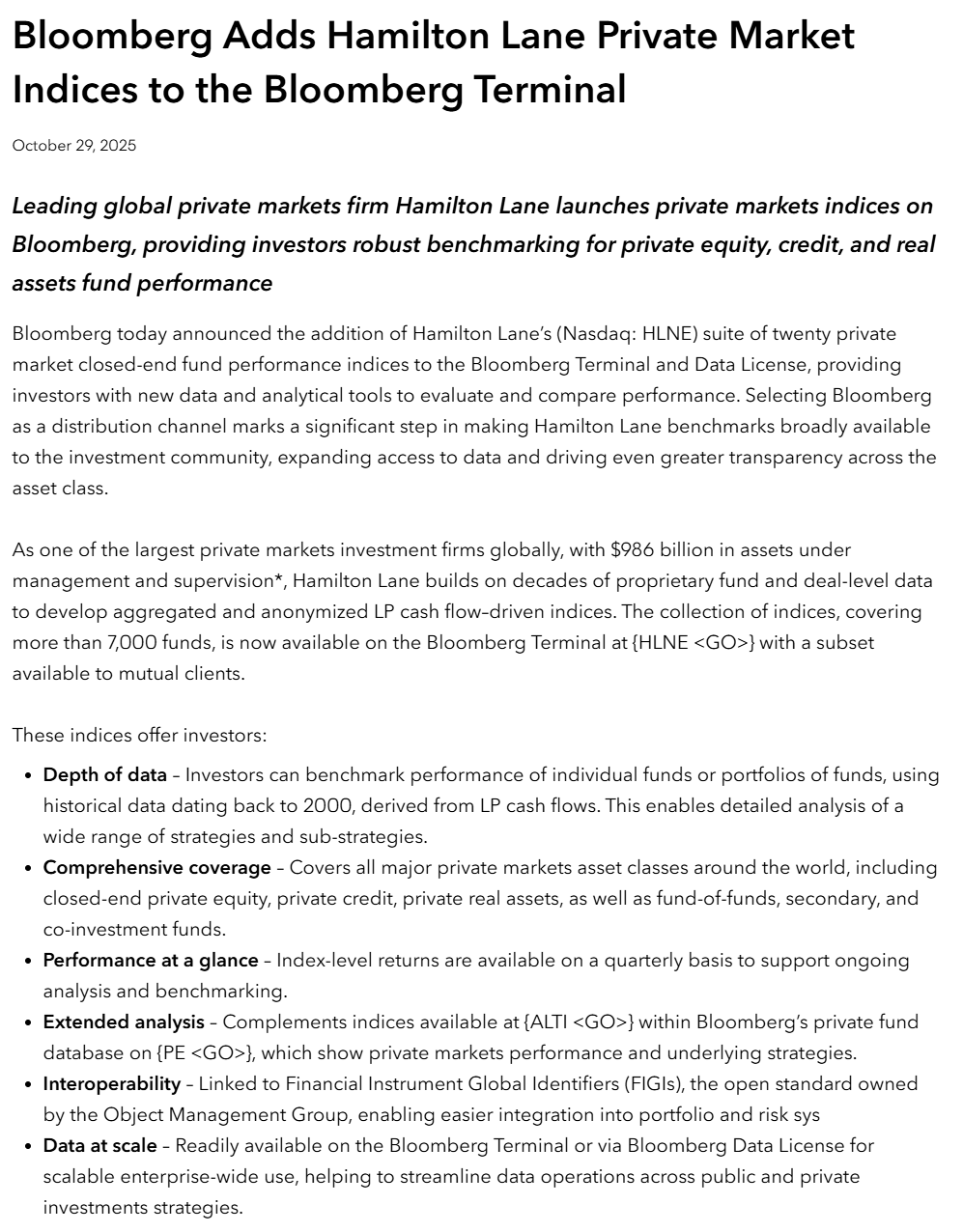 The information presented here is for informational purposes only, and this document is not to be construed as an offer to sell, or the solicitation of an offer to buy, securities. Some investments are not suitable for all investors, and there can be no assurance that any investment strategy will be successful. The hyperlinks included in this message provide direct access to other Internet resources, including Web sites. While we believe this information to be from reliable sources, Hamilton Lane is not responsible for the accuracy or content of information contained in these sites. Although we make every effort to ensure these links are accurate, up to date and relevant, we cannot take responsibility for pages maintained by external providers. The views expressed by these external providers on their own Web pages or on external sites they link to are not necessarily those of Hamilton Lane.