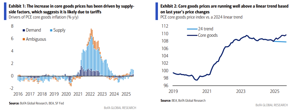 The clearest sign of tariff costs being passed onto consumers is the recent change in goods prices, in our view. Based on the September CPI report, we estimate core goods PCE prices rose by 0.2% m/m. If our forecast proves correct, core goods PCE will have risen by 1.3% over the past year and 2.2% annualized since March, compared to a decline of 0.3% y/y in September 2024. The increase has been mostly driven by supply side factors, providing further evidence of tariffs being the culprit (Exhibit 1). A simple comparison of core goods PCE inflation against a linear trend based on 2024 data also shows core goods PCE is 1.8% above its trend (Exhibit 2).
