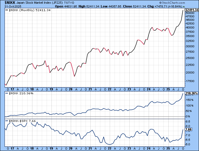 Well, that was an incredible World Series. As a kid, I was spoiled with my local Oakland A's in the early 1970's. Then after the owner blew up the team, a friend took me to Dodger Stadium game and my loyalties transferred to the boys in blue. Once living in Colorado, I turned to the Rockies which was fun until they began playing AAA ball. Since then, baseball has taken a backseat in my life until Shohei Ohtani lit a fire for my old blue team. While I was pulling a bit for the Canadian Jays, it was still a very fun two weeks capped by Saturday night's epic finale. So how can I meld this landmark sporting event into the financial markets? Try this: Since World Series MVP Yoshinobu Yamamoto threw his first professional pitch in August 2017, the Nikkei 225 index has more than tripled over nine years returning almost 14% annualized. The Nikkei has almost even caught the incredible mega-cap tech dominated S&P 500. Congrats to both the L.A. Dodgers and the Toronto Blue Jays. Same time next year?