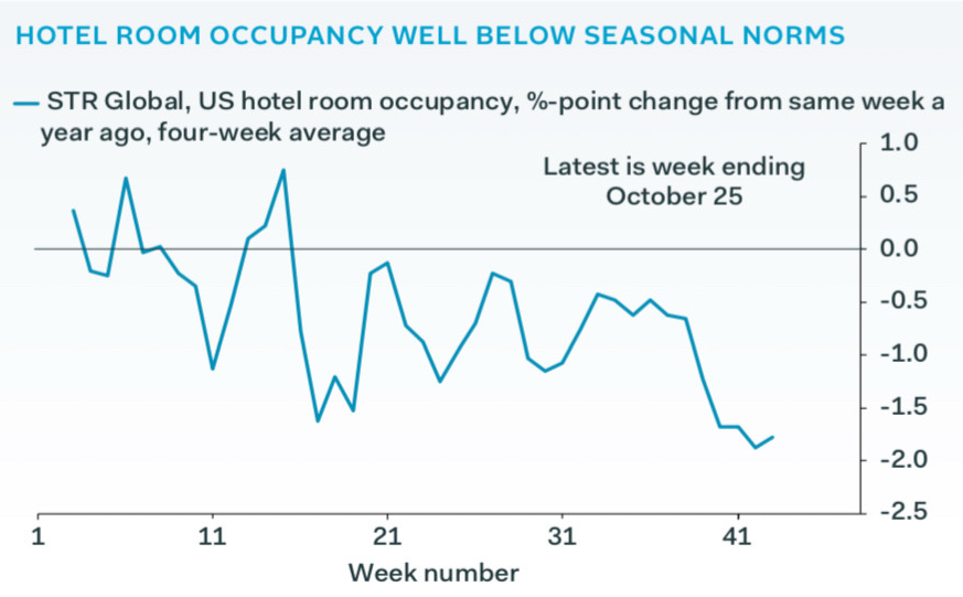@carlquintanilla.bsky.social: It’s getting easier to find a hotel room. “.. occupancy in the four weeks to October 25 has undershot its level a year ago by 1.8pp, much worse than the 0.6pp shortfall in the first nine months of this year.”