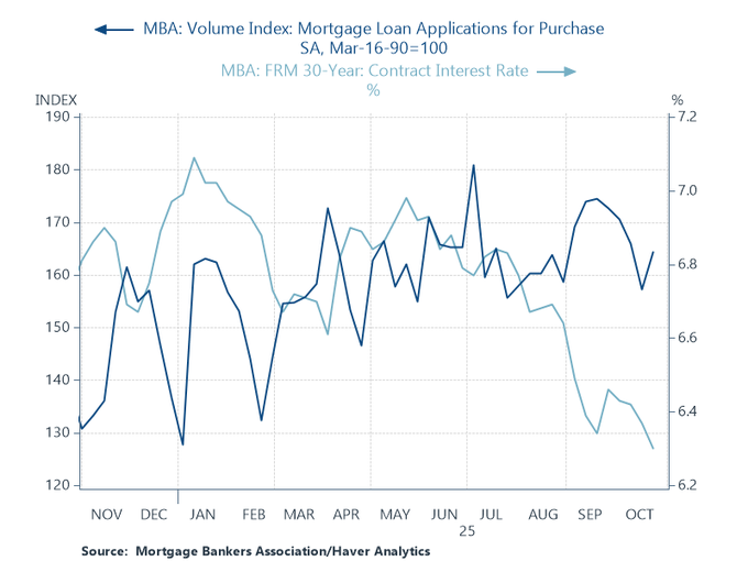 There isn't much juice from lower mortgage rates. Over the last 20 weeks, mortgage purchase applications are essentially flat even though the 30-year fixed rate mortgage has declined roughly 60 basis points. To get purchase demand up, mortgage rates need to decline much more.