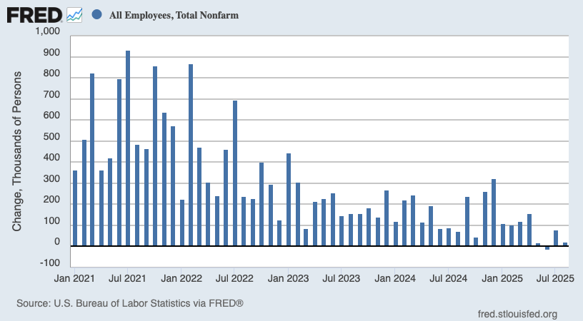 Friday's jobs data left no uncertainty about what the Fed's next move will be. Get out the scissors. Only 22,000 nonfarm payroll jobs were created in August and the downward June revision created the first negative job growth month since COVID. While goods producing jobs continued to shrink, it was the pillars of job growth, healthcare and social services, which slowed the most. At next week's FOMC meeting, hawkish members will need to set aside any worries about inflation and endorse a rate cutting schedule to try to keep job growth from going negative. It looks like Fed Governor Waller's business contacts were correctly seeing a US job market in rapid decline.