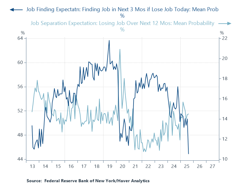 @RenMacLLC: Job finding is the risk in the labor market. According to the NY Fed SCE, the probability of losing a job remains relatively low. However, the mean probability of finding a job if you lose one today plunged to 44.91%, a level never before seen in the history of this survey.